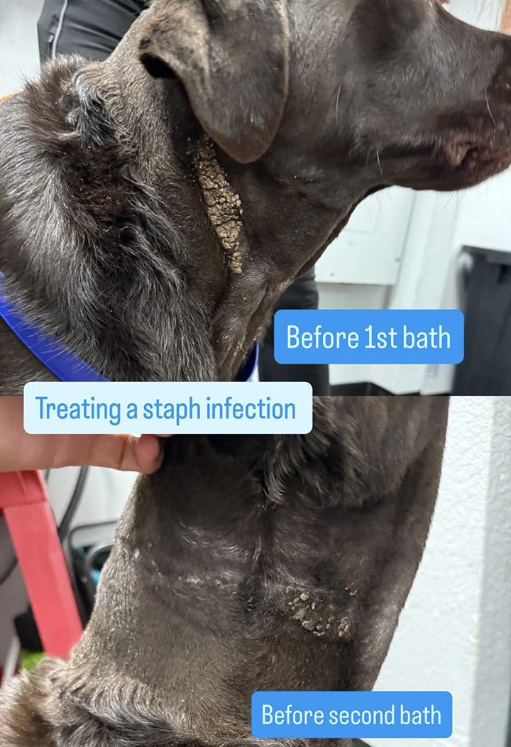 They immediately took him to Lonestar Pet Treats in Cave Creek, AZ for Thera-Clean baths. Look at the difference in just one bath.