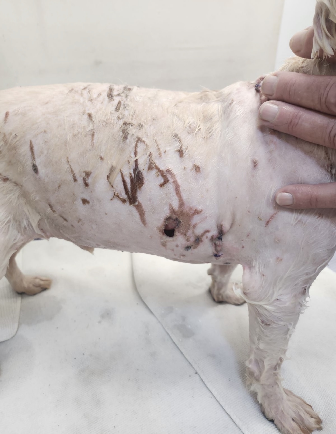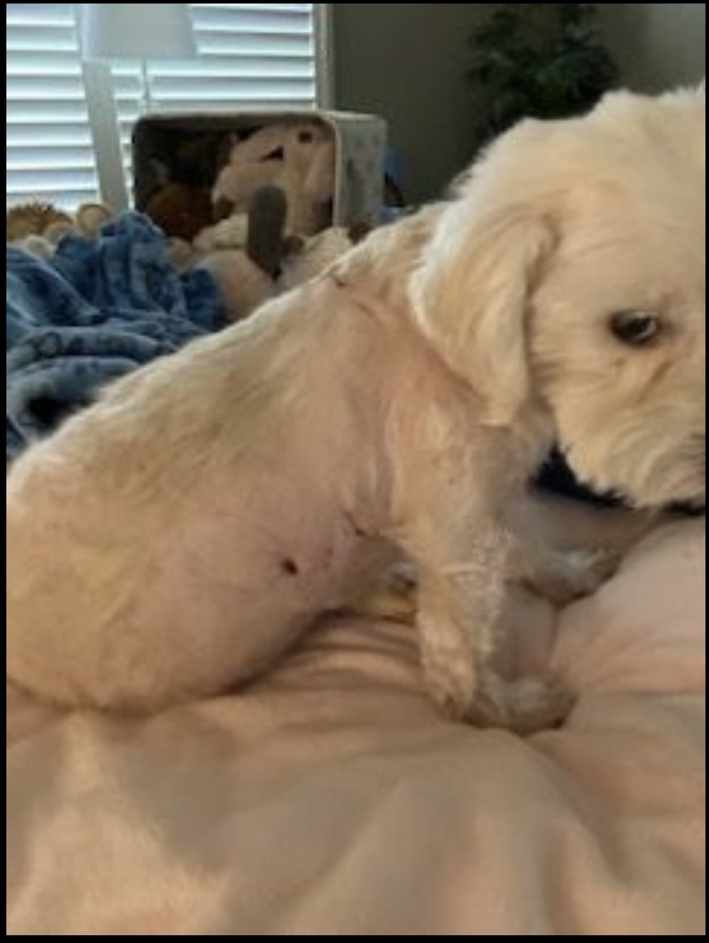 Joshua was abandoned on the streets of Lubbock, TX. He was unfortunately attacked by a pack of dogs and was found by someone who rushed him to a local shelter.  The veterinarian at the shelter stitched him up on some of his wounds but his big one was left open.  Luckily for Joshua, he was adopted soon after and his new mom already knew about Thera-Clean and immediately called King Charles to get him in the microbubbles.