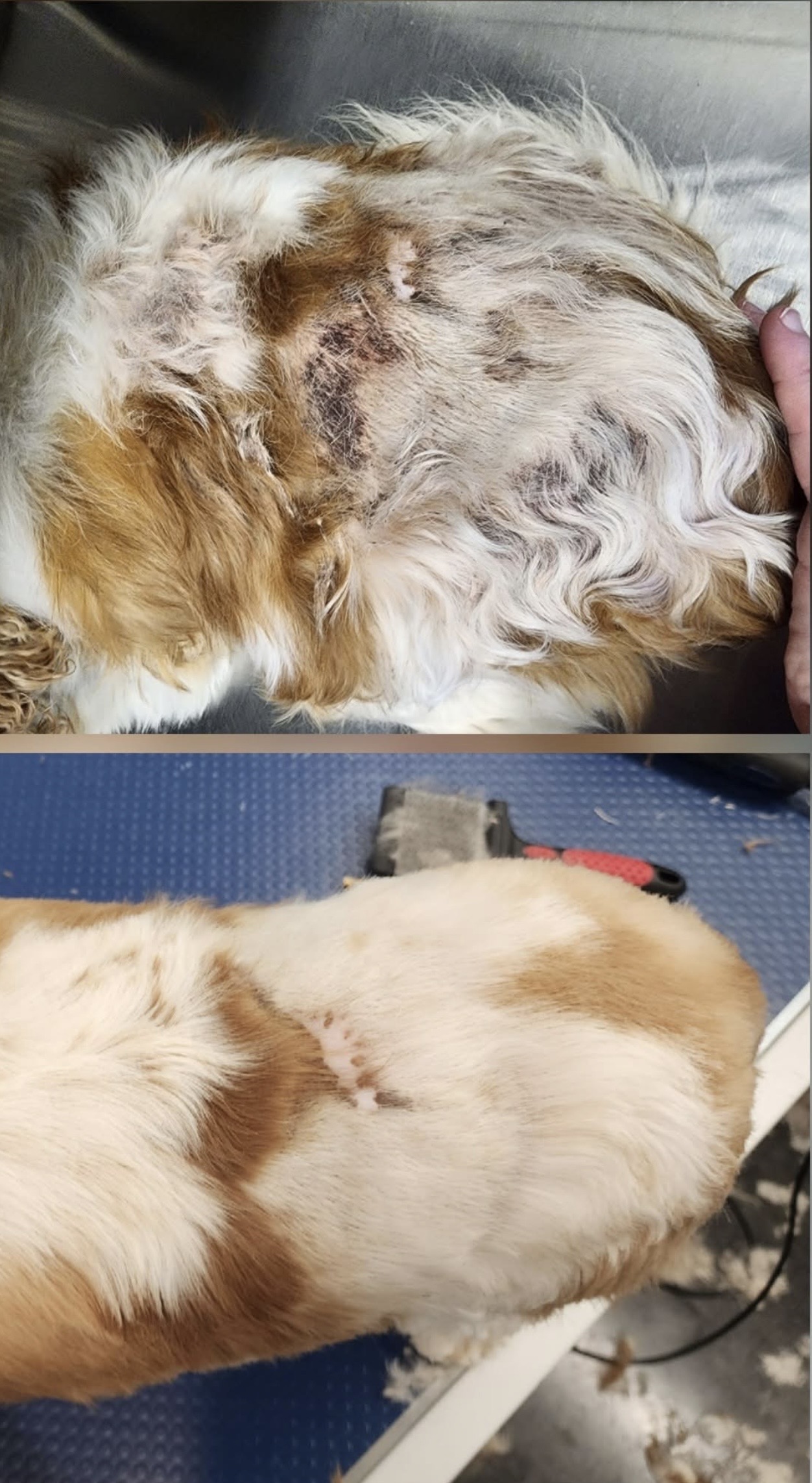 Lily came into Mind, Body & Paws in Dexter, MO with her lower back covered in atopic dermatitis. Amanda knew right away she needed the deep cleaning power of Thera-Clean. Look at this difference in just one single bath!